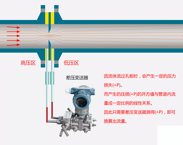 充滿管道的流體,當它們流經管道內的節流裝置時,流束將在節流裝置的節流件處形成局部收縮,從而使流速增加,靜壓力低,于是在節流件前后便產生了壓力降,即壓差,介質流動的流量越大,在節流件前后產生的壓差就越大,所以孔板流量計可以通過測量壓差來衡量流體流量的大小。這種測量方法是以能量守衡定律和流動連續性定律為基準的。
