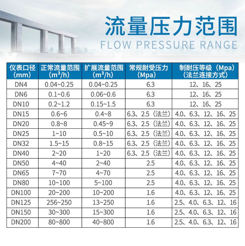 | DN 32 | 1.5~15 | 0.8~15 | 螺紋連接/6.3MPa | 4.0、6.3、10、16、25 |