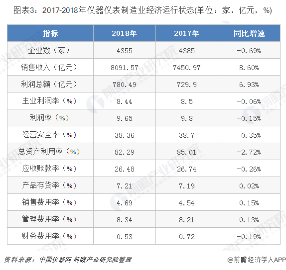 2018年儀器儀表行業經濟運行指標中銷售收入、利潤總額、應收賬款率和財務費用率較上年同期增長,其余7個指標較上年同期略有下降。其中儀器儀表制造業實現利潤總額780.49億元,比上年增長6.93%;主業利潤率為8.44%,比上年下降0.06個百分點。總的來說,儀器儀表行業經濟運行質量與去年基本持平。