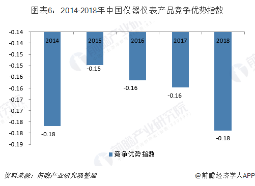 2014-2018年儀器儀表競爭優勢指數維持在(-0.3,0)區間,2018年為-0.18,說明儀器儀表產品在全球具有微弱的競爭劣勢。